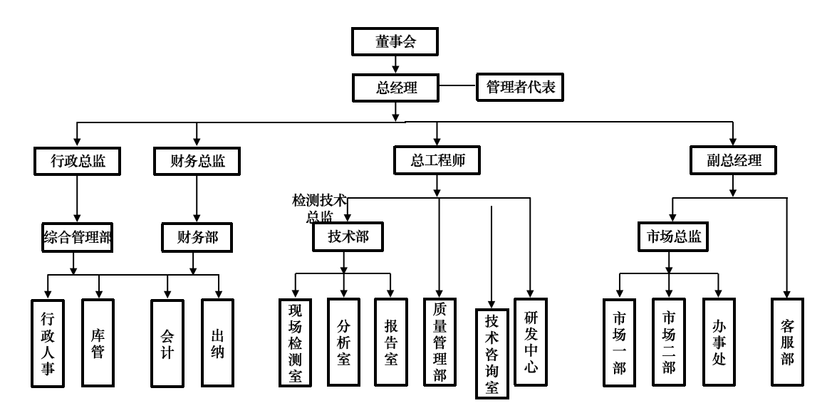 公司設有七個內(nèi)設機構: 包括綜合管理部、財務部、技術部(現(xiàn)場檢測室、分析室、報告室)、質量管理部、技術咨詢室、市場部、技術研發(fā)中心。