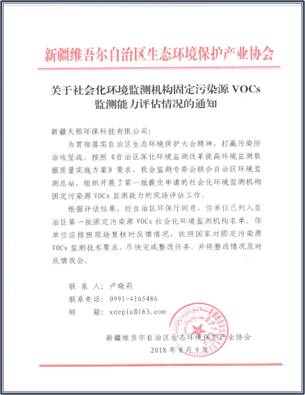 2018年8月獲得自治區(qū)社會化環(huán)境監(jiān)測機構(gòu)固定污染源VOCs監(jiān)測能力評估;